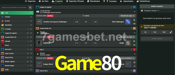 O Game80 oferece uma grande seleção de opções de apostas em e-sports com probabilidades competitivas